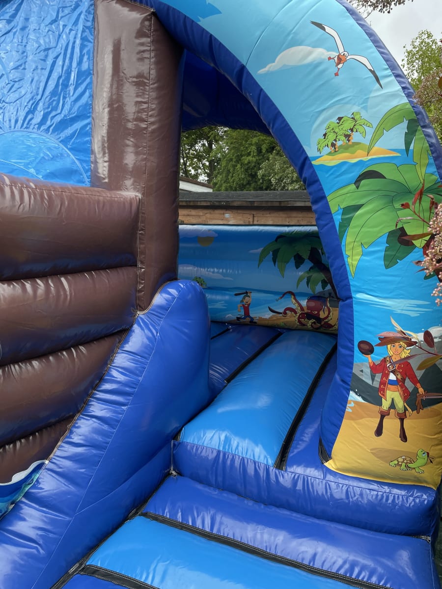 This is our new 14ft x 16ft curved pirate castle/slide combo! Having 2 entrances and the slide coming through the hull of the ship - this castle is totally unique!